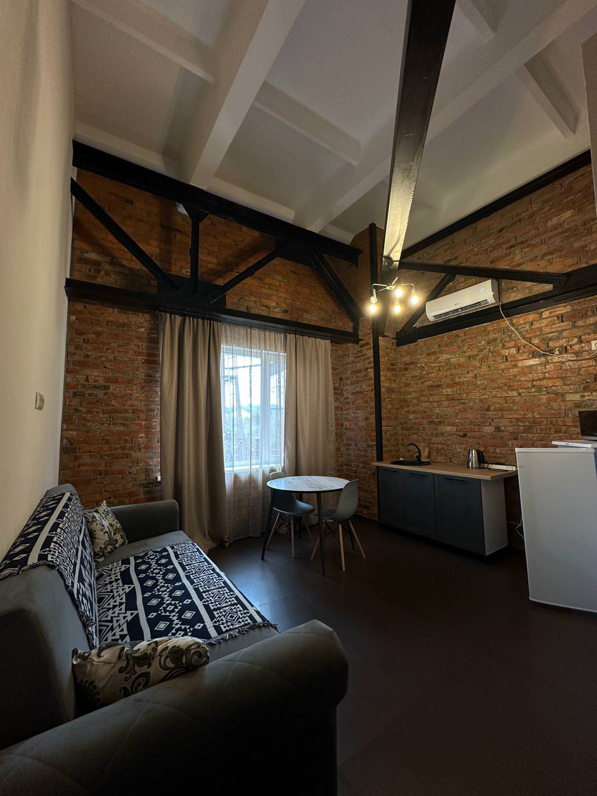 Комфортный номер Люкс удачно сочетает стильный дизайн и домашний уют. В номере двуспальная кровать и диван ещё на 2-х человек, телевизор, Wi-Fi в номере, мини-кухня с холодильником и чайником, шкаф и кондиционер. В ванной комнате душевая кабина и все удобства.