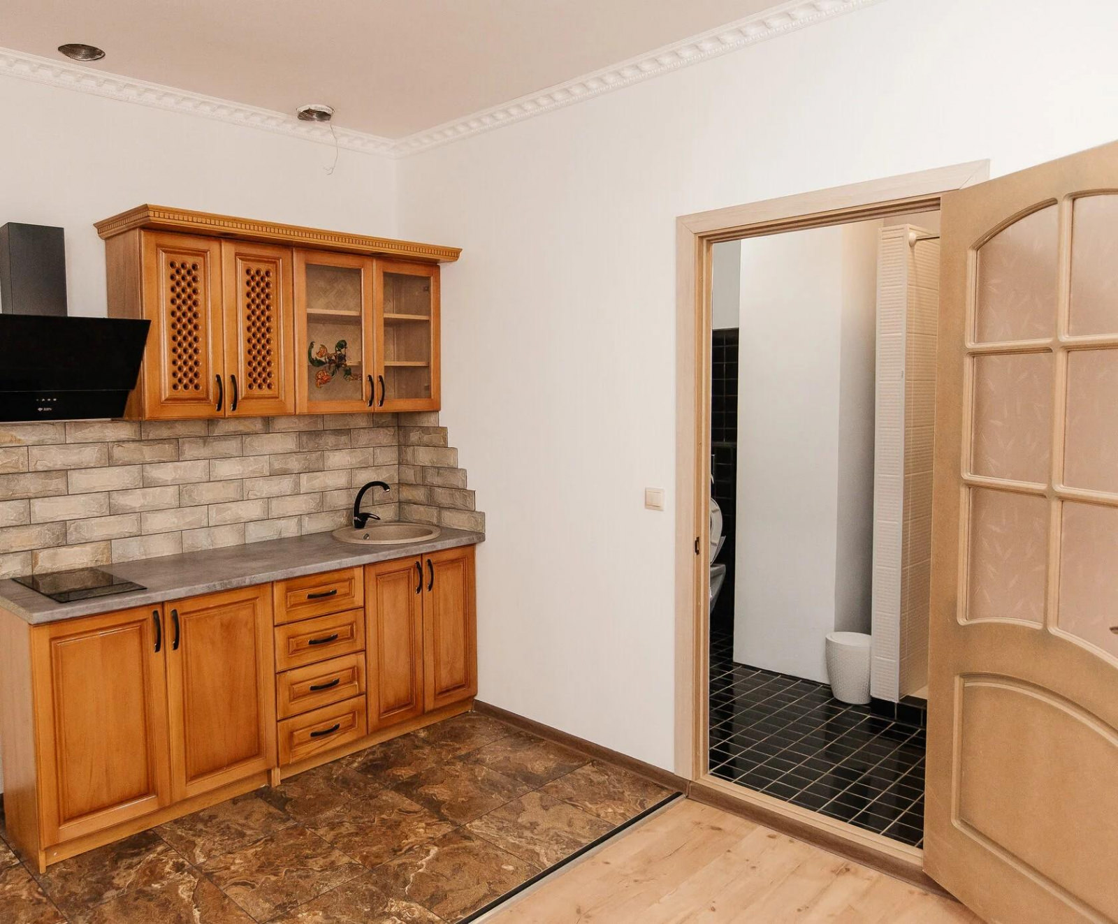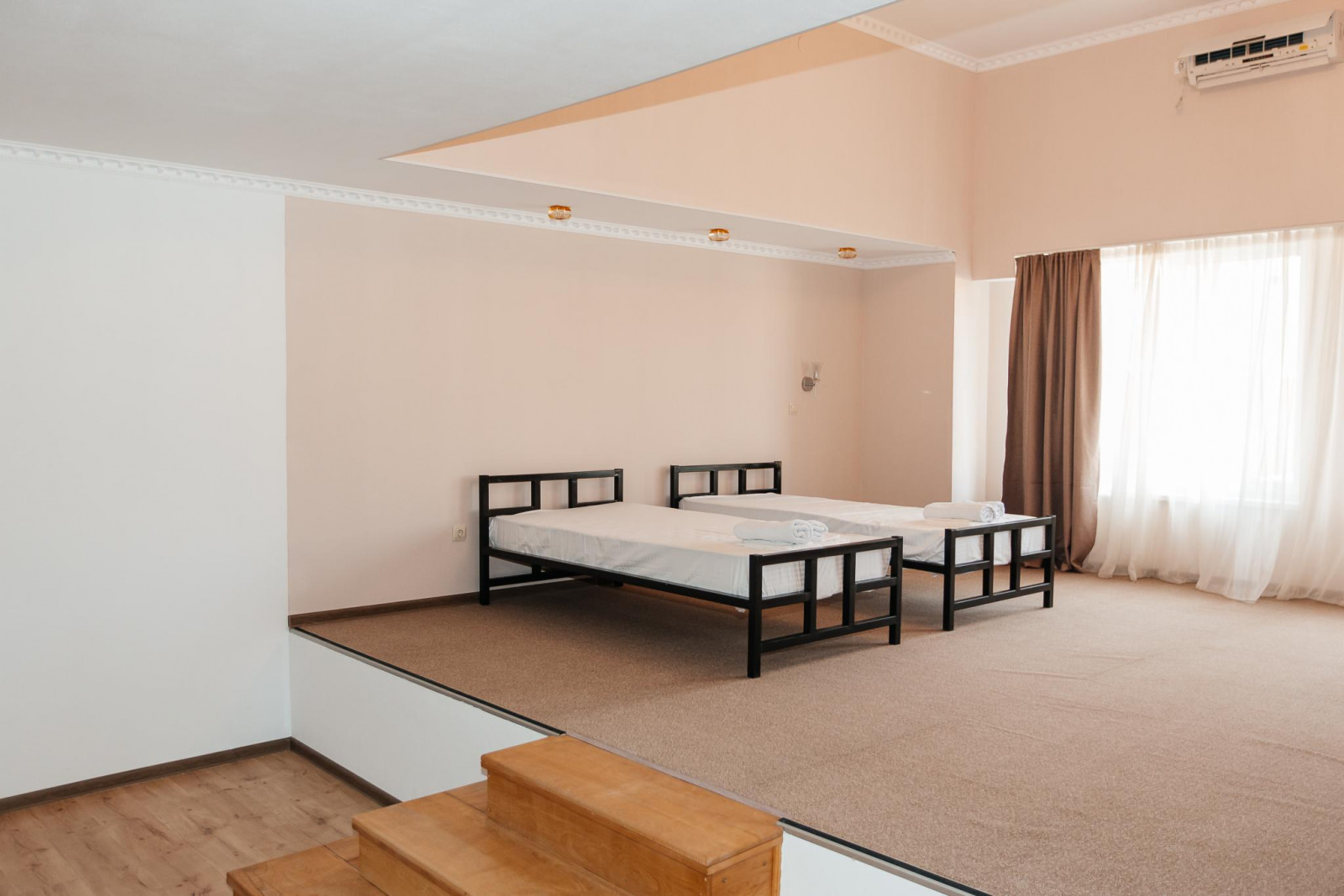 Просторный номер Студия площадью 50 кв.м. со своей кухней отличный выбором для тех гостей, которые привыкли к повышенному комфорту и домашнему уюту. В номере две односпальные кровати, диван, кухня, холодильник, телевизор, Wi-Fi в номере, шкаф, кондиционер. В ванной комнате душевая кабина и все удобства.